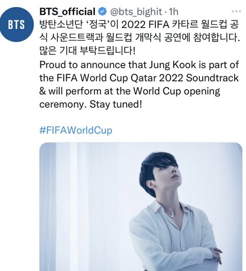 정국이가 피파 월드컵 개막식에 나온데.