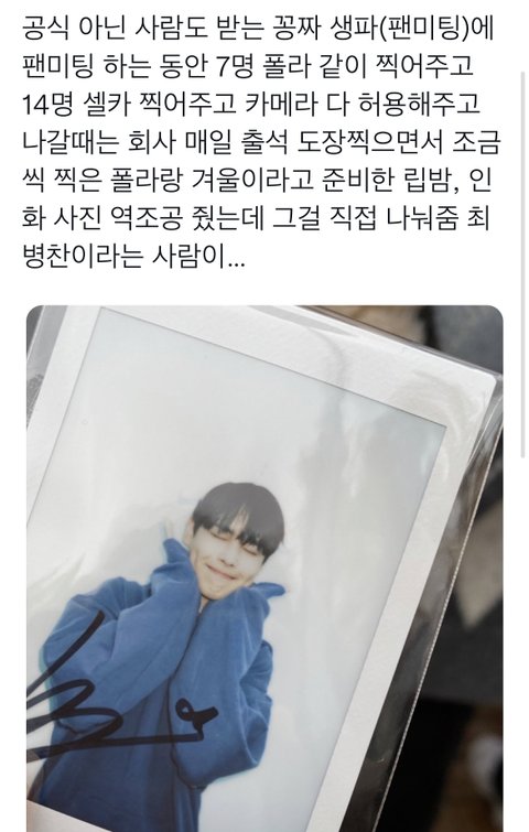 기획자 병찬이 본인이고 끝나고 하이터치하면서 저기 온 230명한테 다 다른 싸인폴라+립밤+인화사진 역조공 해줌.