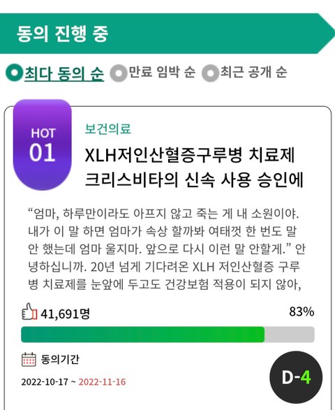 지나치지마시고 청원 도와주세요. 치료제 국내 허가가 나지 않아 사용을 못하고 있습니다.