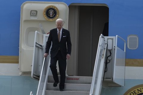 (사진 설명) 동남아시아국가연합(아세안·ASEAN) 정상회의 참석을 앞둔 미국의 조 바이든 대통령이 12일 캄보디아 프놈펜에 도착해 전용기 계단을 내려가고 있다.AP뉴시스