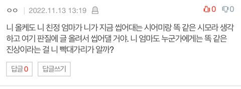 실제로는 이런 식으로 말 못 할 거면서 익명이라고 뇌 없이 천박하게 말하는건지… 좀만 더 예의 있게