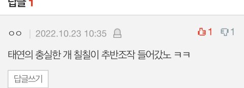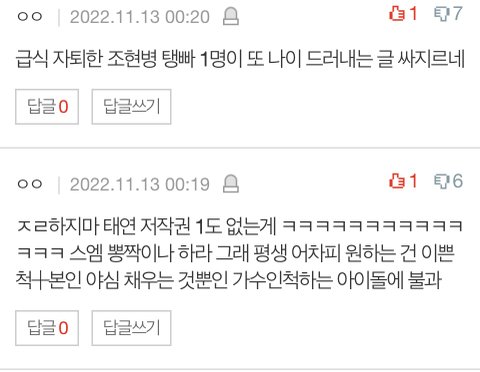 댓글에 본인 등판한게 킬포임 부들대며 반대 1씩박고 지랄발광하며 밑에 댓글 세 개 달았네. 어휘 선택도 급식탱빠 이러는데 진심 나이 많은거 티남 나이먹고 추잡스럽다 진짜ㅋㅋ