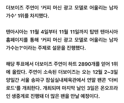 커피 머신 광고 모델로 어울리는 남자 가수 1위