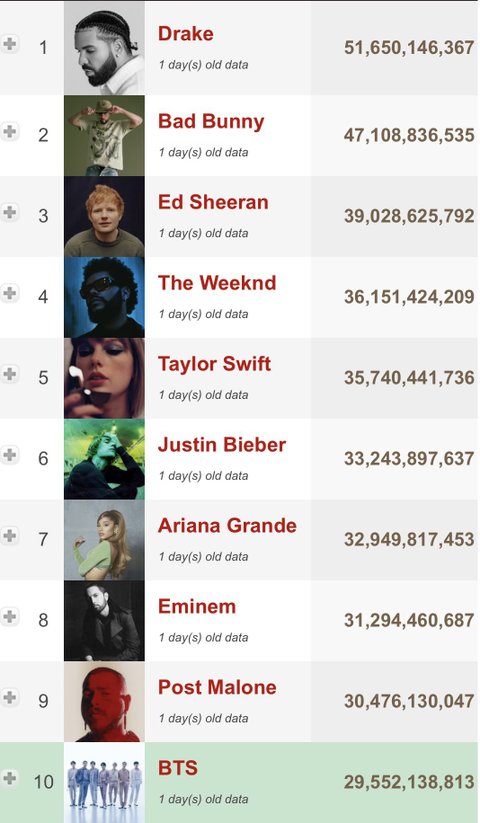 애초에 전세계 모든나라 아티스트 순위 진입해 있음 스밍량 많은 순위