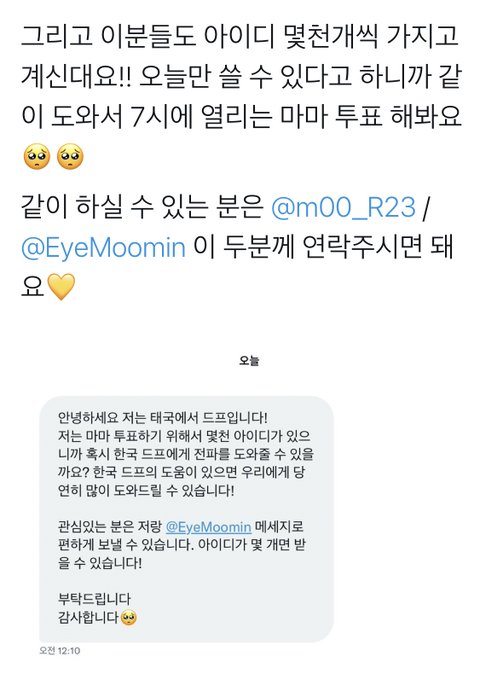 계정 올려놓을게(좀다삭제할게) 해외드프분들께 아이디받아서 투표하자 ㅜㅜ!!!!!! 저전력 모드로 하면 광고도 안 봐도 돼서 금방금방가능!! 조금씩이라도 동참해줘♡