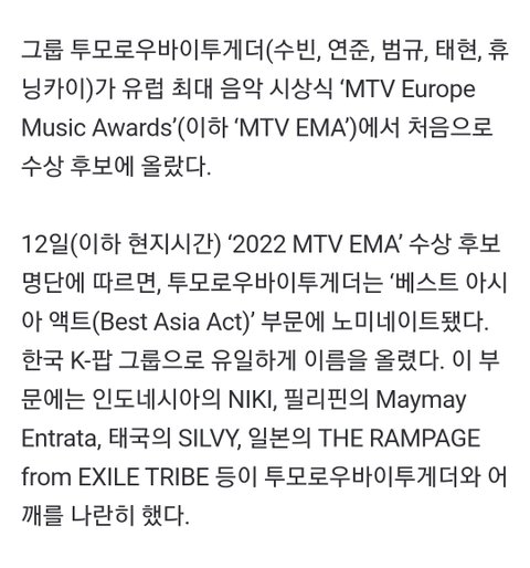 유럽 최대 음악 시상식 EMA 케이팝 가수 유일하게 노미였는데 수상까지 달다 달아