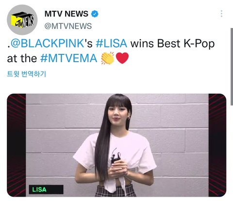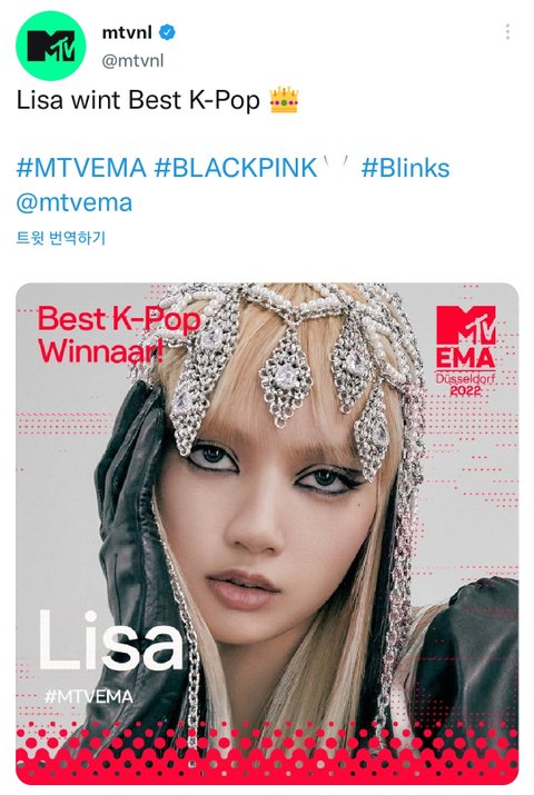 그룹 블랙핑크 리사가 '2022 MTV EMA'에서 베스트 K-팝 상을 수상했다.