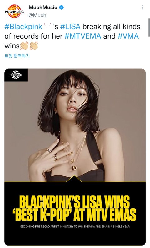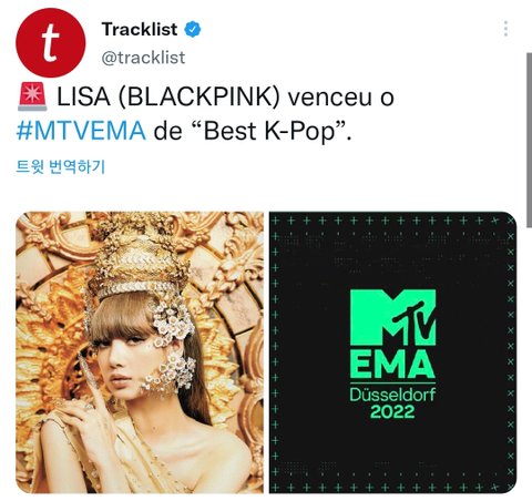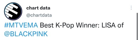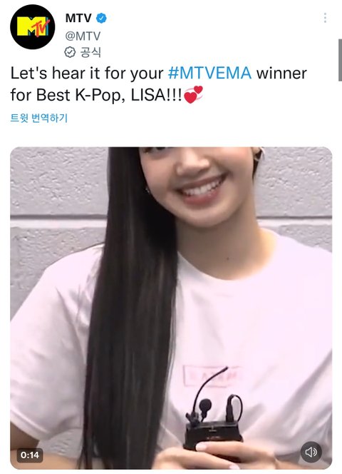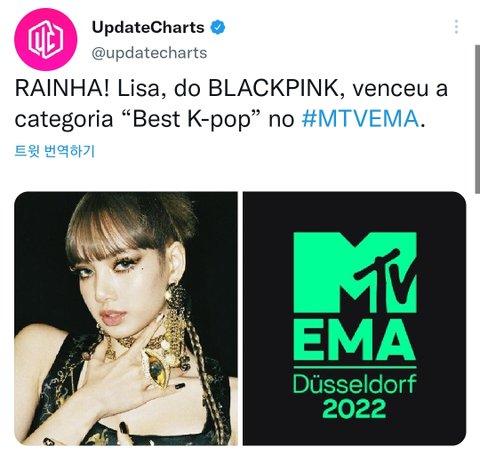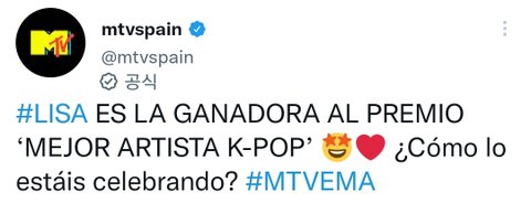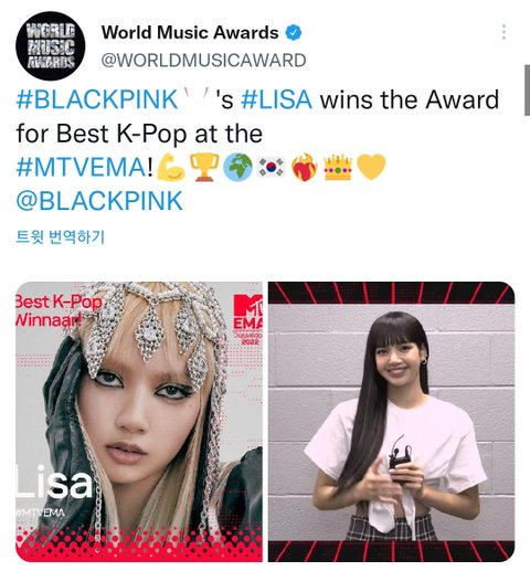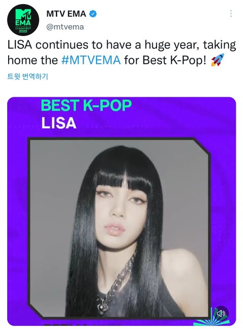 리사는 13일(현지시간) 독일 뒤셀도르프 PSD 뱅크 돔에서 열린 '2022 MTV 유럽 뮤직 어워즈'(이하 '2022 MTV EMA')에서 '베스트 K-팝(BEST K-POP)' 부문 주인공으로 호명됐다. 리사는 영상을 통해 수상 소감을 전했다.