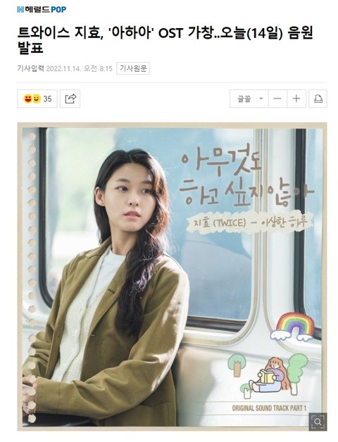 한편, 트와이스 지효가 가창한 드라마 '아무것도 하고 싶지 않아' OST Part.1 '이상한 하루'는 오늘(14일) 오후 6시 각종 온라인 음원사이트를 통해 만나볼 수 있다.