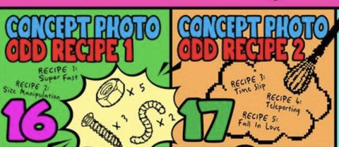 레시피 1. Super fast 2. Size manipulation 3. Time slip 4. Teleporting 5. Fall in love면 순서대로