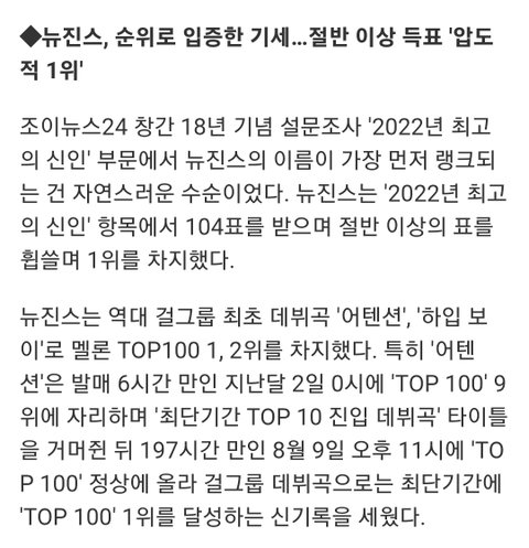 뉴진스, 역대 최강 임팩트 입증…최고의 신인 1위
