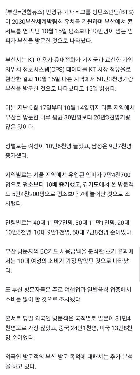 방탄 부산콘 당일 외지에서 50만명 유입됐대