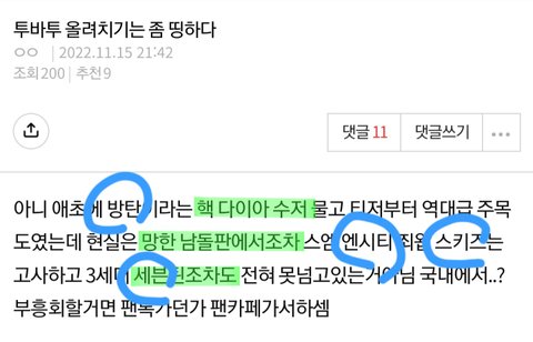 아니 애초에 방탄이라는 핵 다이아 수저 물고 티저부터 역대급 주목도였는데 현실은 망한 남돌판에서조차 스엠 엔시티 죄왑 스키즈는 고사하고 3세대 세븐틴조차도 전혀 못넘고있는거아님 국내에서..? 부흥회할거면 팬톡가던가 팬카페가서하셈