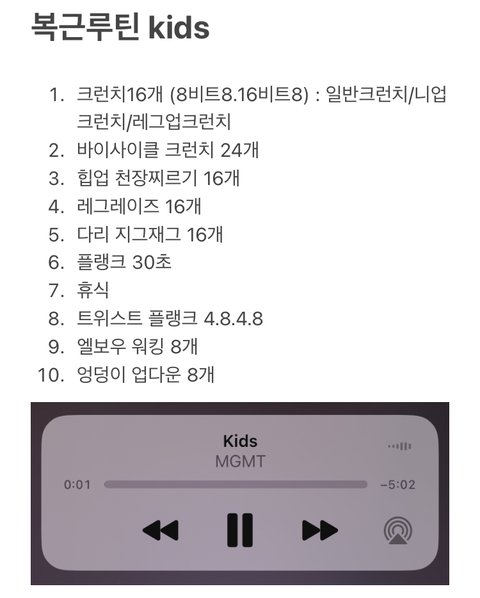 -복근루틴은 MGMT Kids라는 노래에 맞춰서 했는데 비트가 일정해서 신나고 하기 좋음 최대한 말로 풀어봤는데 알아들었음 좋겠다..