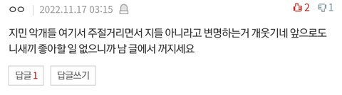와 같멤버한테 니새끼래.. 심지어 남글.. 본문 문제되는 까글인데 본인들 글이라고 인정함.. 그치.. 증거없고 지민계도 피해받았는데 정정같이 하는것보다 같이 동조하면서 지민까는 애들이 정상일리 없지.. 애초에 멤버 까는게 말이되냐고.. 찐 개인팬들은 다른 멤버들한테 크게 억하심정 없고 이론 글 제목만 보고 나감.. 정정하거나..