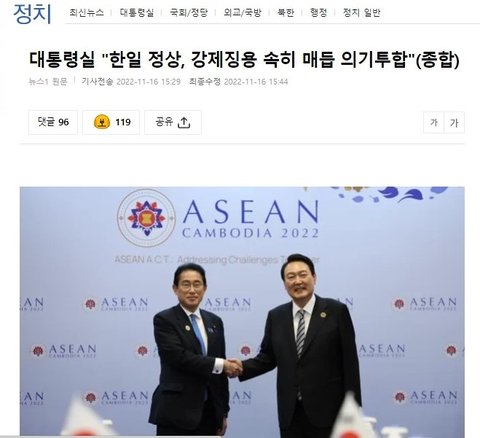 닛케이신문은 14일 보도에서 “윤 대통령이 강제징용 문제의 조정 상황을 (기시다 총리에게) 설명한 것으로 보인다”며 “외교 채널을 통해 한국 기업 등이 출자하는 재단(일제강제동원피해자지원재단)이 일본 기업의 배상금을 대납하는 방안을 제시했다”고 보도.