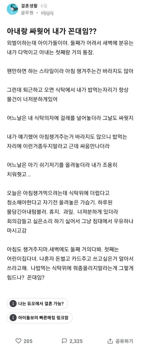 공무원 벌면 얼마 번다고 끽해봐야 한달에 300정도 받을 거 같은데 저 돈으로 애 둘 키워야 하면 스트레스 장난 아니겠는데? 금수저 아닌 이상 집은 당연히 좁겠고 그래서 너저분한거 아님?? 물건 둘 데가 없어서.. 식탁에 자리가 더러우면 소파나 거실에서 먹음 되는데 침대에서 먹었단 거 보니까 미투나 투룸 빌란가 본데