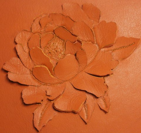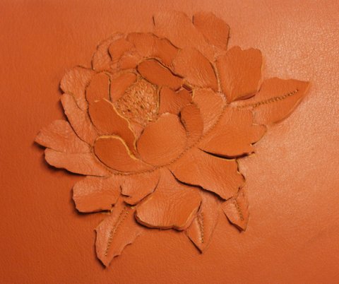 가죽에 모란 디자인을 커팅 기법으로 입체 조각하였습니다.(마디샤)