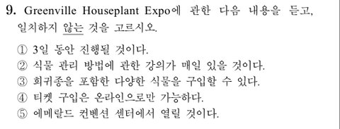 일단 이게 9번 문제였음 ㅋㅋㅋ 뭐가 문제였냐면 일단 성우가 말을 비교적 빨리함+발음을 좀 대충함+억양이 조카 물흐르듯함(보통 답이 될수 있는 키워드는 강조해서 말해주거나 말한다음에 한턴 쉬는데 이번에는 그냥 좔좔좔 읊음) 이 세개가 합쳐져서 당황스러운 듣기가 됨ㅋㅋㅋㅋ 정답은 2번인데 나도 집 와서 다시 들어보니까 everyday가 아니라 just on the opening day라고 잘들렸지만 현장에서는 2~4번까지 너무 줄줄 이어져서 제대로 안들렸음ㅠ 아마 현장에 있던 많은 사람들이 어라…?했을거임 ㅋㅋㅎㅜ