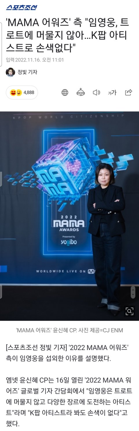 남솔 음원음판 다 합친 예측 순위 1위던데 후보도 두부문에나 올랐던데 못나올 이유가 있냐? CP가 직접 인터뷰도 했더라 더이상 트로트에만 국한된 가수가 아니고 k팝 아티스트로서 손색이없다고... 그리고 트로트가 뭔상관? 마마에 발라드,락밴드,힙합 다 나오는데,