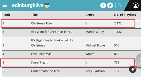 스포티파이 순위에서 가장 인기 있는 크리스마스송은 Christmas Tree by V