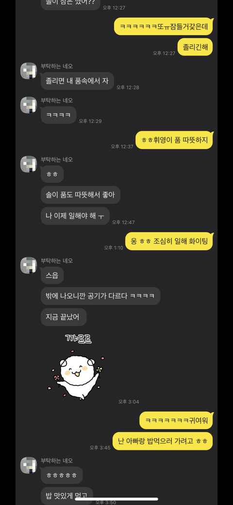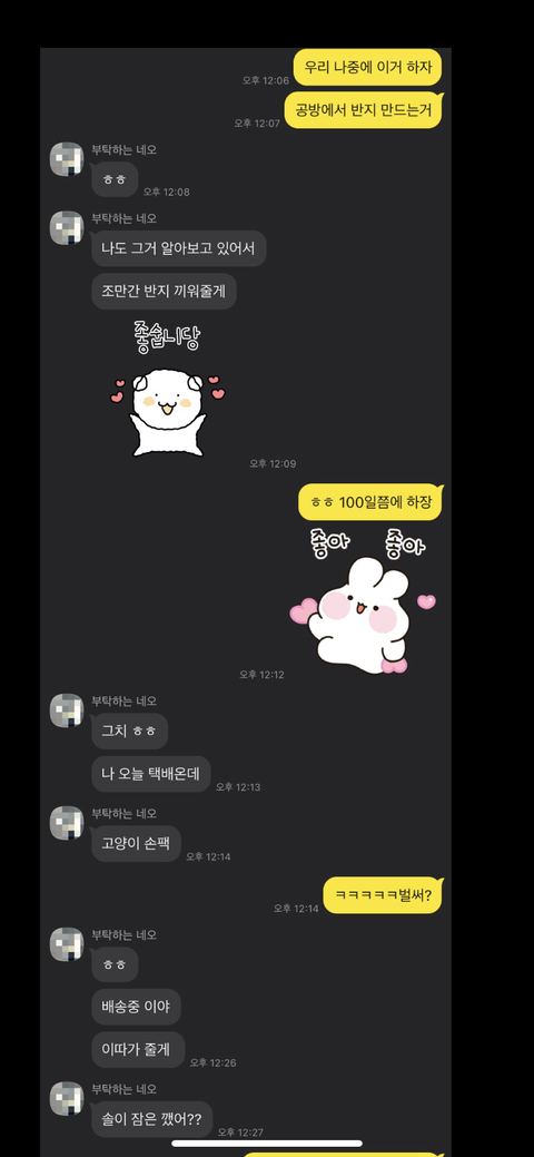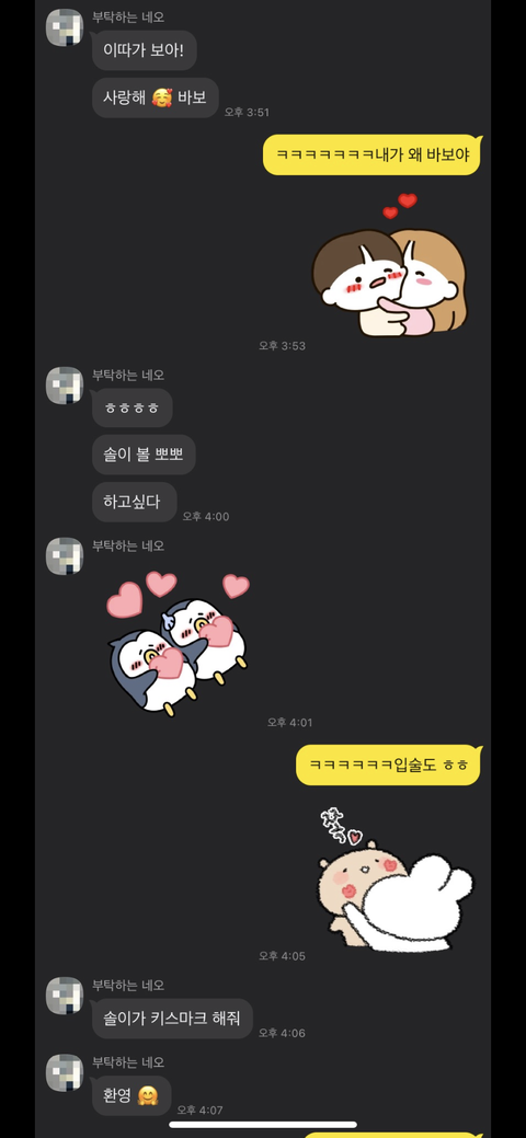 100일, 반지공방.. 이런거 말하는걸로 보아, 사귄지 60~70일쯤 된 20대 초중반 같은데, 약간의 스킨쉽은 있었으나, 아직 실제 잠자리는 안한 것 같고. 네오새퀴는 어떻게든 빨리 한번 해볼라고 안달난 병신새퀴 같음. 이 짧은 대화만 봐도, 딱 보이는게... 이 새퀴 머릿속에는 그거뿐임.