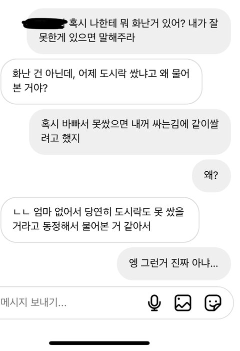 도시락 쌌냐고 물어본 거에 기분 나빴던 건 그럴 수 있음 나도 엄마 없어서 수능 도시락 사서 가서 이해가는데 너가 안 쌌으면 같이 싸주려고 했다고 말했는데 그이후에 ㄴㄴ동정하는 거 같아서 ㅇㅈㄹ하는 건 무례해보임 의도 알았느면 지가 사과해야지