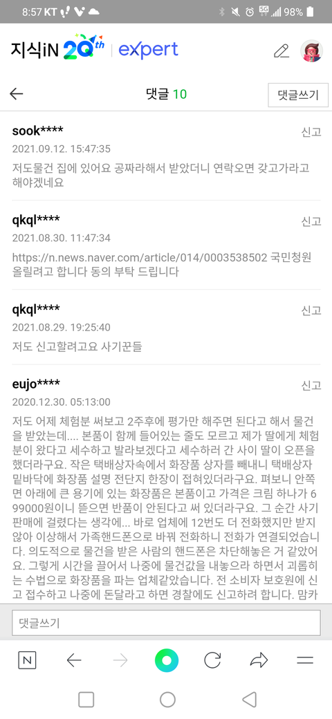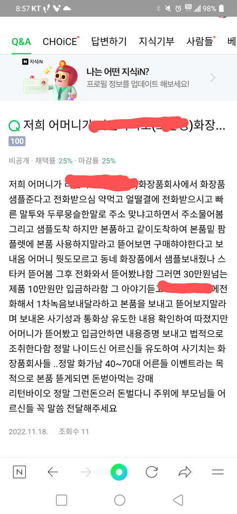 나이드신 분들 상대로 등처먹는 업체 같은데 여러분들도 조심하세요 사진 다 첨부합니다. 하 용량이 안돼서..우선 지식인 사진부터 올리고 다시 올릴 수 있도록 해볼게여....ㅜㅜㅜㅜ