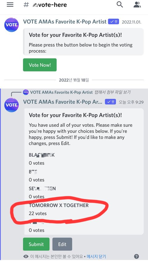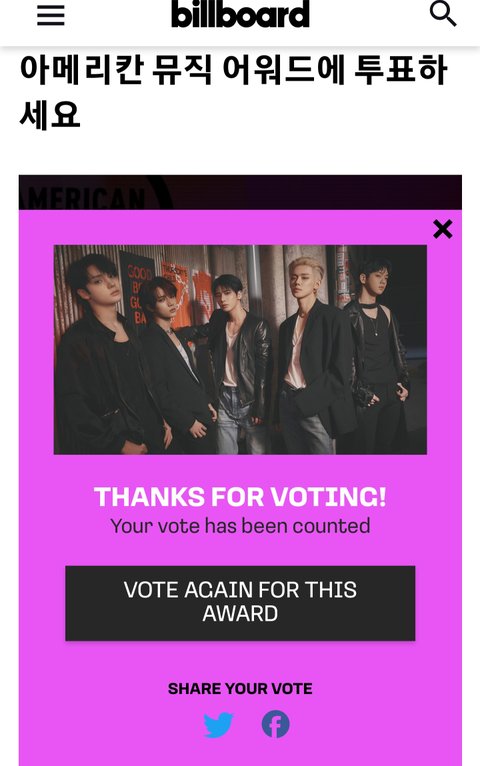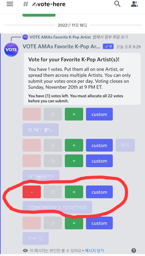 AMA 투표 22번 연속 클릭만으로 투표할수 있으니 오늘분 꼭 해줘 애들 초대받아서 가는데 열투해야지 https://twitter.com/TXT_STVOTE/status/1593430944480137216?t=FUaU5BZT0YCJvaSTMLnvgA&s=19