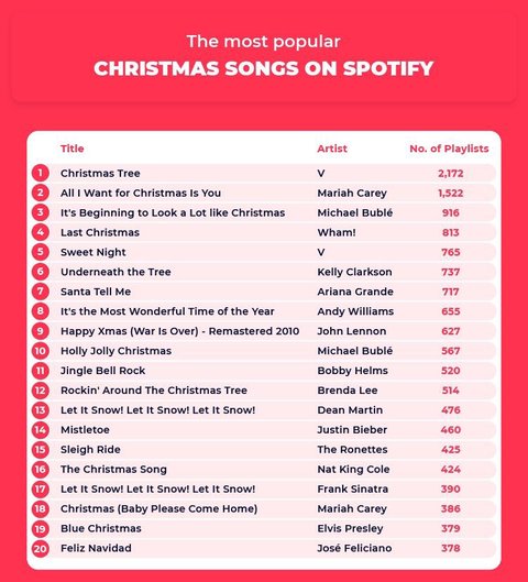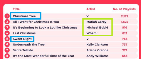 본문에 설명이 필요해 보인다 .----------영국의 최대 뉴스 미디어그룹 Reach plc의 에든버러라이브가 발표한 스포티파이 플레이리스트에 가장 많이 선정된 인기 있는 크리스마스 노래는 다름 아닌 뷔의 ‘Christmas Tree’였다. 2172개의 크리스마스 노래 플레이리스트에 선곡된 ‘Christmas Tree’에 이어 머라이어 캐리의 ‘All I Want for Christmas Is You’ 마이클 부블레의 ‘It’s Beginning To Look A Lot Like Christmas’가 뒤를 이었다.