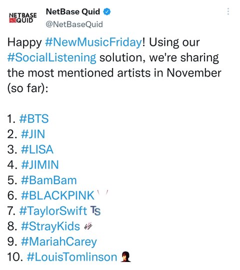 소셜 미디어에서 11월 'NEW MUSIC' 관련 '가장 많이 언급된 아티스트 톱10'