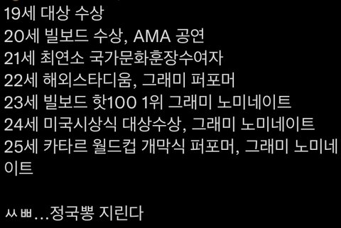 지난번 인상깊었던 베댓 봤는데 소설 드라마에서도 이 스펙으로 캐릭터 만들면 너무 현실성없다고 욕먹는다고ㅋㅋㅋㅋㅋ 진짜 갓생이다 전정국