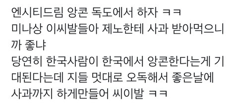 저거 일본팬들만 문맥지들이 잘못꼬아보고 꼬투리잡아서 난리난거임.. 투어를 그나라만 가는것도 아닌데 제노 사과버블받고 일본인빼고 다들 어리둥절인것만 봐도 누가 음침한지 답나오지않나