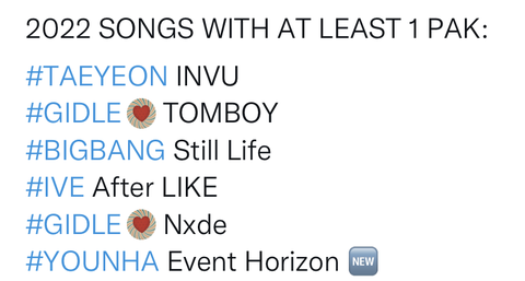 2022년 음원차트 PAK(퍼펙트 올킬) 달성한