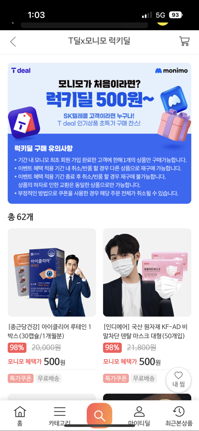 T딜에서 온 문자 링크 들어가서 모니모라는 앱 가입했더니 루테인이랑 곱창이랑..다 500원에 살 수 있어서 핵이득 공유드립니당 (SKT 쓰시는 분들만 해당되는 것 같아용)