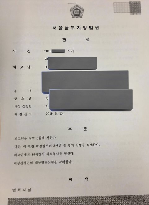 피해자를 상대로 '사기''횡령'이라는 2번의 범죄를 저질렀던 조**님에게단 한번도 사과의 말을 들을 수 없었습니다.