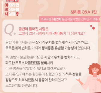그러던 중 어렸을 때는 크게 생각하지 않은 새로운 정보를 찾게되었는데…!!저처럼 생리통에 고통받는 분들이 바로 골반의 뒤틀림 현상때문이라는거에요! 저는 매번 생리통이라는 통증에만 중점을 두고 약을먹고,, 한약을 먹고 뭔가 자궁의 문제라고만 생각했는데 그게 아니라 골격의 문제인 골반이 뒤틀린 경우에는, 그렇지 않은 여성분들보다 생리통이 심하다고 홍연희 분당서울대 병원 교수님께서 말씀이 하신게 있었어요..