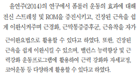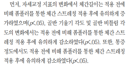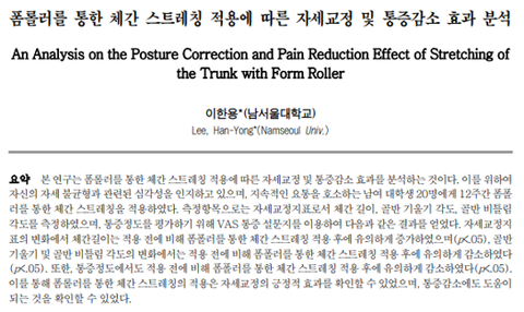 (출처: 논문 – 폼롤러를 통한 체간 스트레칭 적용에 따른 자세교정 및 통증감소 효과 분석)