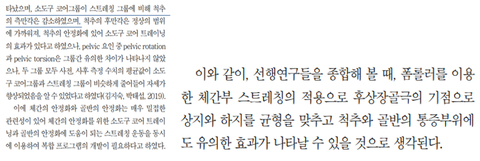 또한 체간(몸통)의 안정화와 골반의 안정화는 매우 밀접한 관련성이 있기 때문에 이러한 척추 측만각 감소와 같은 체간의 안정화에 도움이 되는 소도구(폼롤러)스트레칭이 매우 효과적이라는 내용이 있었어요!! 결론은 척추가 휜각도가 심하면 체간의 안정이 떨어지고 결국 골반에도 문제가 생긴다는거죠!