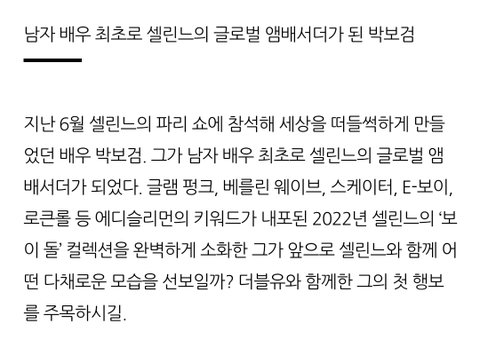 리사가 글로벌 최초일 정도로 셀린느 글로벌 앰버서더 귀한데 박보검이 남배우 최초 글로벌 앰버서더라니.. 개멋있음