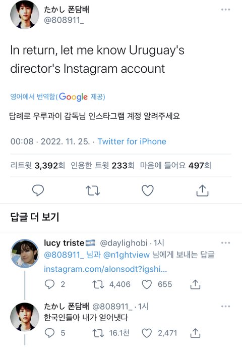 우루과이 저주하는 글에 우루과이 나라사람 등판했는데 프로필이 우루과이 유니폼 합성한 호비사진임ㅋㅋㅋㅋㅋ 아니 오늘 한국이랑 경기했는데..?ㅋㅋㅋㅋㅋ