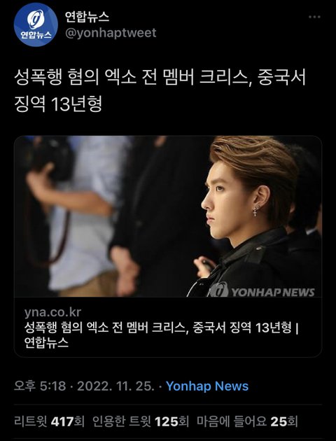 엑소 전멤버 크리스 징역 13년형 받았대..
