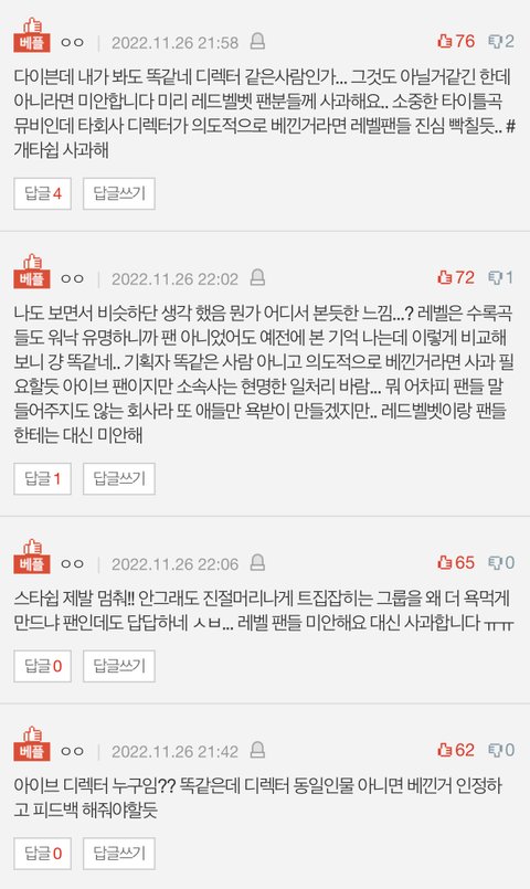 다이브인데 보고 욕나왔음. 스타쉽 일 ㅈ같이 함. 레벨 팬들에게는 미안합니다. 대신 사과할게요. 우리 레이가 레드벨벳 진짜 좋아하는데 이런 일 생겨서ㅜㅜ