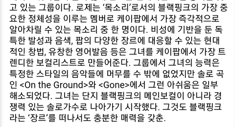 로제보컬덕에 블핑그룹이 차별화 되는거 아님?로제같은 음색이 어딧냐고ㅋㅋ올려치기가 아니라 블핑이란 그룹에서 로제보컬 빠진다 생각해봐 걍 평범한 걸그룹같은 느낌인데?오히려 로제가 힙합 여그룹에서 손해보는 느낌임