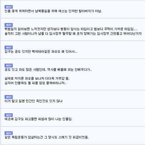 우리 역사에 가장 미화된 인물은 김구.. 일명 킬구임. 무고한 일본상인 살해 ╋ 순진한 청년들을 꾀어 독립운동한답시고 브라질 여자 살해 ╋ 광복 후 친일파들한테 뇌물 받고 정당활동 ╋ 대통령병 걸려서 좌우합작 파토내고 나라 분단시킨 원흉 ╋ 엄청난 보수주의자에 권위주의자로 혼자서 옷단추도 안 잠그고 다 비서들이 수발해줄 정도.. 엄청나게 흠집이 많은 인간인데 박정희가 쿠데타로 정권잡고 이승만 내려칠려고 일부러 김구를 엄청 미화시켰음. 물론 이승만은 김구보다 훨씬 악랄한 인간이지만 이미 많은 사람들이 그건 다 알고 있잖아. 반면에 김구 이미지 생각해봐. 역사를 제대로 알아야지