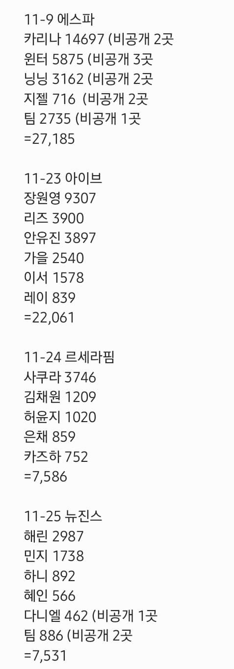에스파 카리나 윈터 닝닝 지젤 아이브 장원영 리즈 안유진 가을 이서 레이 르세라핌 사쿠라 김채원 채원 허윤진 윤진 은채 카즈하 뉴진스 해린 민지 하니 혜인 다니엘