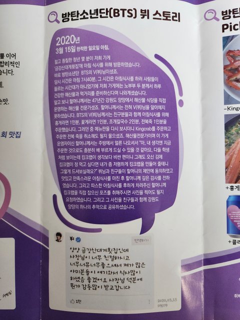 강원도 대게집 갔을때 비하인드 자세히 적혀 있어 사장님이 너무 친절하셨다고 아미들한테 저리 공유하는 태형이도 너무 이쁘지~