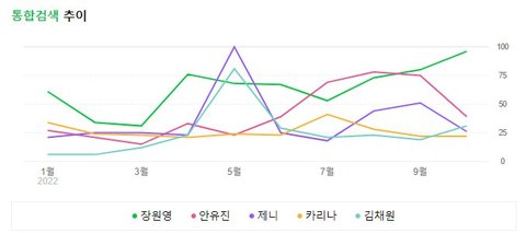 1위 장원영(아이브)2위 안유진(아이브)3위 제니(블랙핑크)4위 카리나(에스파)5위 김채원(르세라핌)