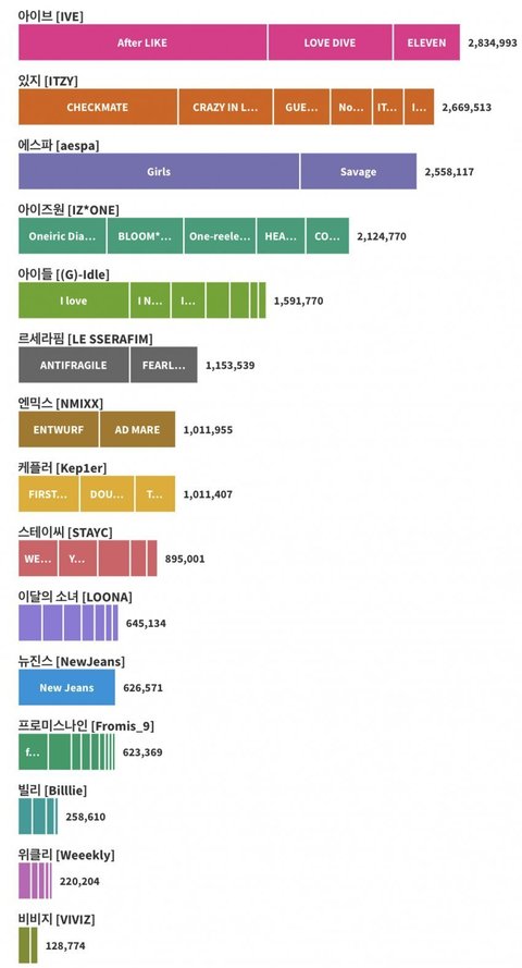 아이브 있지 에스파 아이즈원 여자아이들 르세라핌 엔믹스 케플러 스테이씨 이달의소녀 뉴진스 프로미스나인 빌리 위클리 비비지