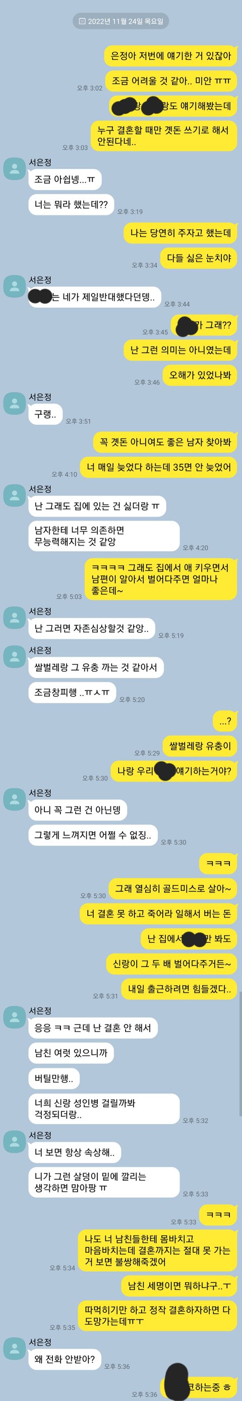 저희 고등학교 동창 6명이서 곗돈 붓는 게 있어요. 애 낳을 때 서로 돕자는 의미에서 한 건데 은정이가 비혼이라 선언하고 애 낳았다고 치고 돈을 그냥 달라고 하더라구요... 근데 저희는 그렇게는 못 주고 그동안 부은 것만 그대로 돌려받거나 아기용품 사주는 거 아니면 안된다 했어요. 근데 얘는 그거에 화나서 저랑 신랑, 아이까지 모욕했구요.